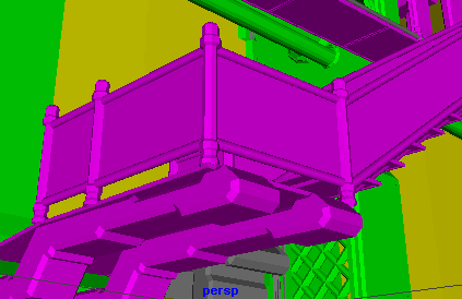 Modelling One of the tedious and time consuming part when creating pictures is modeling. But ... you need to do it ... empty scene is not very interesting for the viewer. ;) So let's go and see what I have done in this scene when it comes to modelling. First, I will list the tools I use often. The detailed explanation of those tools can be found maya manuals. It is best to create empty scene and test these tools until the moment when you are familiar with them. Remember that you need a lot of hours working with basic Maya tools before you have enough practice to take the next step and create a little more complicated stuff. Just to give you a short list of the tools I use very often when modeling: Create menu: Nurbs stuff: sphere, cylinder, plane, circle ... Polygon stuff: sphere, cube, cylinder, plane, CP Curve Tool, Edit Curves menu: Attach and Detach curves, Open/Close curves, Cut curve, Curve Fillet, Rebuild Curve, Surfaces menu: Revolve, Loft, Extrude, Bevel Plus, Edit NURBS menu: Project Curve on surface, Trim Tool, Insert Isoparm, Polygons menu: Create polygon tool, Append poly tool, Combine, Booleans, Smooth, Edit Polygons menu: Texture > Planar Cylindrical and Spherical mapping, Subdivide, Split Poly Tool, Extrude Face, Bevel, Cut Faces Tool, Merge Verices, Fill Hole. But let's see how can they be used to build up objects. I will take a few models from the scene and explain the process of modelling them. BTW the models from this scene, individually, are not complicated to do, but when you stick them all together in the scene they give a different, more complexed perspective. Left Building For my first example I will take the model of the building on the left. Some elements of this mode are left out compared to original model from the picture, to make things simpler. I have rendered one image with that model. It is divided by colors so it can be easier to explain what I am talking about. Just click on the image to get the full size.