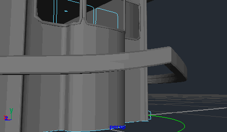 Transport Venichle: We are not finished with modeling. ;) So, for the second part of the modeling I will show you how I did the transport ship-bus. Parts of this model were made with NURBS and other with polygons. For example the yellow element in the picture below are made with three NURBS surfaces, while the chains are made with polys. If you are doing stuff with polygons then you know what teseelations will look like, while when you are working with NURBS you have to set tesselation manually for every surface. There is also the other way ... and that's to let the MentalRay use global tesselassion for every object in scene. Just in case you want to try this it is under the Window > Rendering Editors > Render Globals then in mentalray menu go to the Overrides > Tesselation and click the checkbox on the left of Surface Approx. Now get back to model. Yellow part - top floor First the yellow part of this model (image above). It is a simple nurbs object made with simple path curve and revolve, but let's go step by step... First you have to draw profile curve like the one in the picture below. As you can see, I did that in front view, and in the centre of the scene ... in this way the pivot will be aligned to the center of the scene. The curve is made with, as usual, CP Curve Tool with 3 Cubic degree.