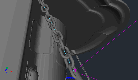 In case the chain elements are too close or too far to each other, go to the channel box and in Outputs - snapshot change the increment to lower or higher value and then do the update: Animate > Update Motion Trail/Snapshoot. Do this until you get the right distance. There is still one more thing we have to do ... all chain elements lay in same plane, they are flat and unreal. First step to do, to correct this, is to select that chain element that is attached to the curve. You can notice him by moving the time slider and see which one is moving. ;) Now grab him, move to the frame one where he is at the start of chain, and in channel box go to the Inputs - motionPath ... then set the Front Twist to 0 and keyframe this. Now go to the frame 100 and do another keyframe but this time set the value to something like 1440. That value worked for me, but you can play with this to suit your needs. After you did that do another Update Motion Trail/Snapshoot and that's it (picture below).
