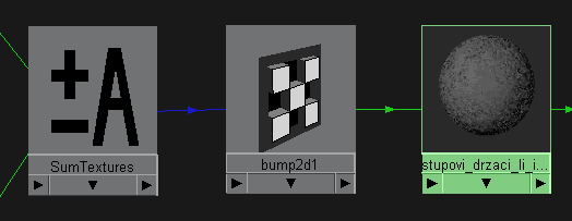 The rock 3D is the first texture ... it lies at the bottom of this shading network. It has the connection to the SolidFractal3D.colorGain. To make connection between them just drag and drop the rock to fractal using midle mouse button. What this does is that the color informations from Rock 3D are used to multiply the values from SolidFractal. Of course, the options of both textures were modified from thir default values. I have spent some time tweaking them to get the right result ... don't think I got it with first shot. ;) Then there is another procedural texture that is mixed with the previously created SolidFractal. This one is marble (picture below) ... again slightly tweaked to fit my needs. Blend node (blue-red below) was used too, as the name says, to blend these two textures together. There is a slider in the blend options called Blender with which you can change the blend factor of these two. If it is set to 0.5 then it will use 50% of the first and 50% of the second texture to mix them together. In my situation I have set it to 0.7 to use 70% of the second texture (marble) and blend the 30% of the other input which is solidfractal. The blend factor can be mapped with any other floating value .... so if you would have the need to do some more complex textures be free to try to map it with some 2d or 3d textures.