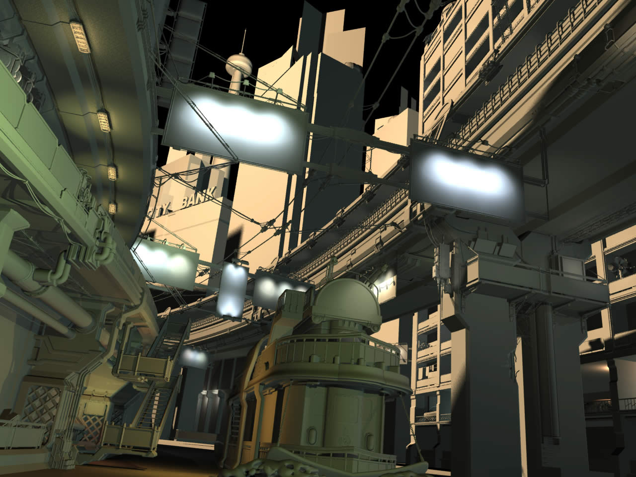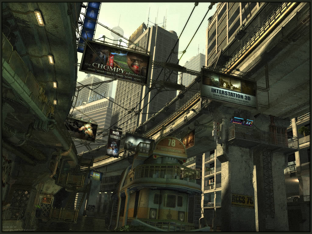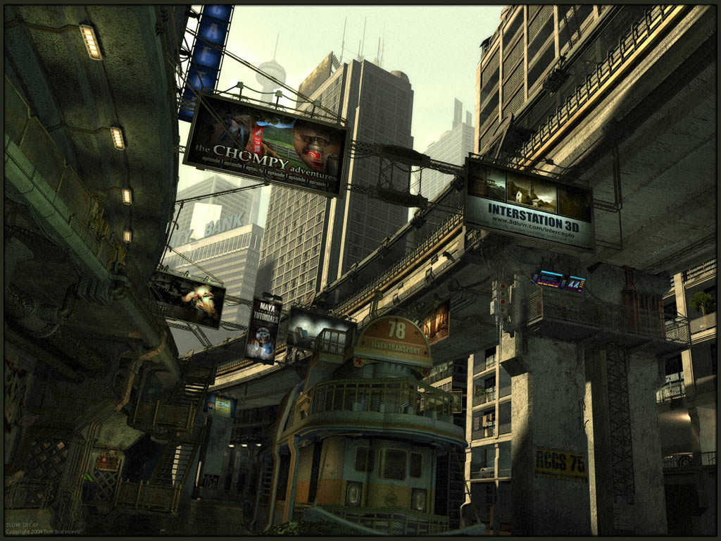 As you can probably see I don't do full modelling and then go to texturing lighting. I tend to mix all of those three steps together. For me it is more fun to do it this way, but it is really up to you to decide how will you do it. Ok, now the next picture was one test that I did to see how the scene will react to the final gather pass. That's the reason why some parts are brighter compared to the picture from step above. Final gather and Globall Illumination can be of great help when you need to light up your scenes quickly and realistically, but as the name says it is globall and it can not be controled localy. For example if I want to light up that tiny part of the scene a little bit more, and I use spotlight for that, the effect of it when using FG will be more global because light reflects and bounces around the scene, compared to the version without FG where the effect of the light is local and directional. The other reason why I didn't use FG and GI was the time it takes to render your scene. For example, the render time for Slow Decay is around 3 hours. If I have used FG and GI it would take around 10 hours, maybe more. But don't get me wrong ... FG and GI are great, and I am using them in two new pictures that I am working on right now. Yes, I forgot ... you can also see that I also worked on signs, textures and new lights. I also moved the venichle a little bit back so that it blends better with the scene. Now the picture ;)
