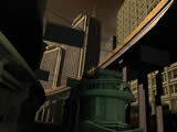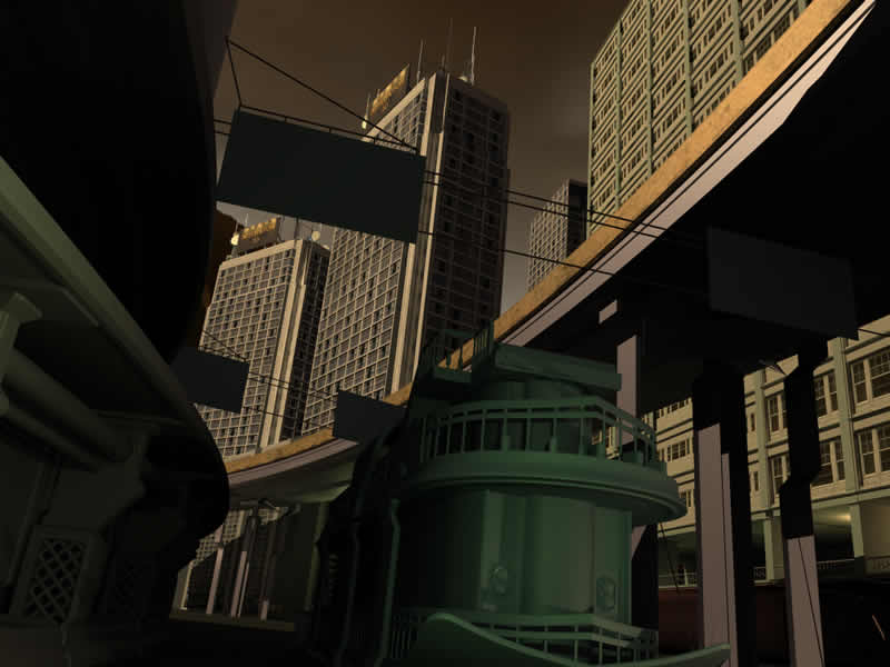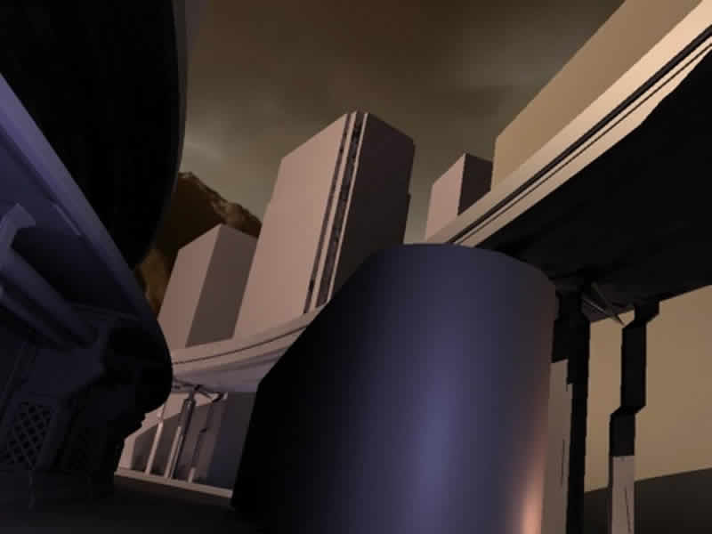 The next thing that I have tested is the fog. Now, the Maya has its own fog shader but once the fog is created it can not be changed without rerendering. That's why I tell MentalRay to render the Z Depth Map whith which you can easily add fog in postprocessing program like Digital Fusion, Combustion or some other. It's easy to get the z depth map from Maya, but I will explain that in the rendering part of the tutorial. One thing that I have worked on are the two monitors and the platform at the pillars on the right. The picture:
