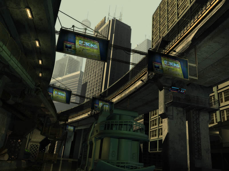 That was the first thing that I have done in next picture (below). I have also created 5 new textures for the signs ... that was done in Photoshop. And there is also the new sign at the second row of the signs in the back. This one is oriented vertically to break up the repetition a little bit. I have also added the sign on the right pillars RCCS 75 which stands for Road Control Center 75. ;) There are also other new elements, be free to explore the picture below and discover them by yourself ;)