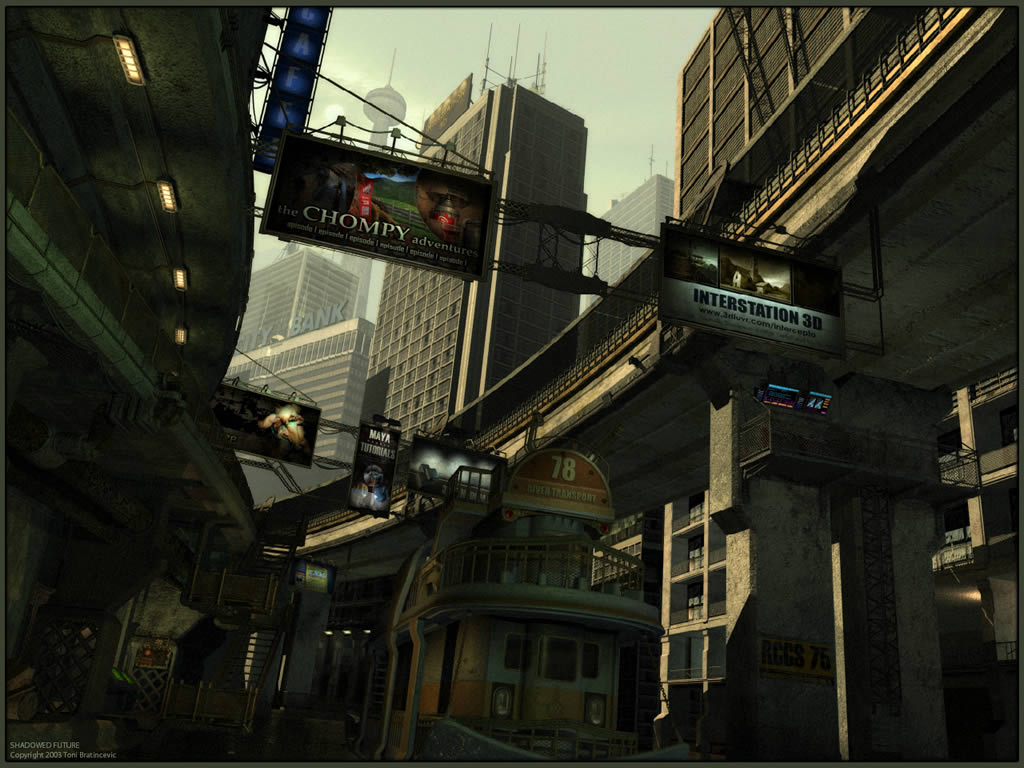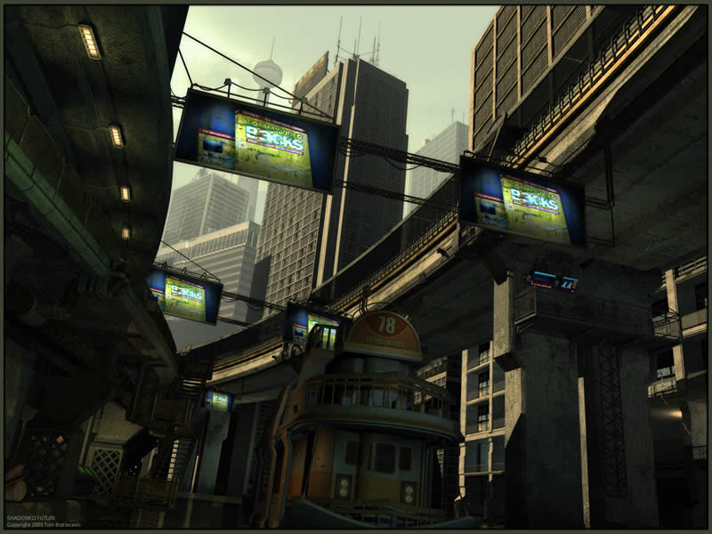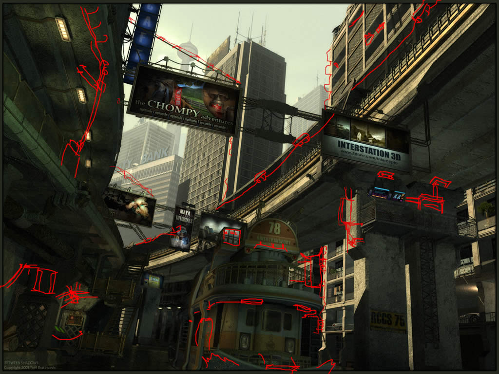 Just a few steps from the final image. I added more details like the wires between highway and left building. This wires gave the completely new touch to the image, it enhanced the world above and below them ... they made the cut between these two levels of the image. I was really satisfied with them, but they need a little bit more work on them. This was the moment when I decided to make image a little bit more brighter because my monitor was not calibrated very good, and at some other computer the image was too dark. So I tweaked nearly all the lights in the scene. There is also one detail in the passage at the top left part of the picture for which I didn't make a good light setup .... they were too dark. The last WIP picture: