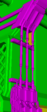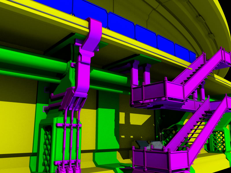 For the other parts of this structure on the left, I will not go through the whole process of modeling ... I will just mention in few sentences how I did these objects. So for example, the magenta stuff in the picture below was not too hard to do. I have used similar tools like in the previous parts. The process always goes in similar ways. For some parts I have created the profile curve, then Bevel Plus and duplicated this part few times. For the pipes I have used the cylinder and extrude-move-scale it few times to get the shape. There are also some simple primitive objects, like torus .... they are used at the position where pipe gets into the object below.
