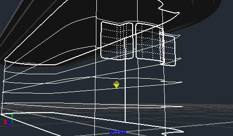To make this object more interesting, we will reshape the front end of it. To do this select the vertical isoparm in the front and then break the tangent to get the sharp edge ,,, Edit NURBS > Surface Editing > Break Tangent. Now select the CVs like in the picture below and move them in the z direction...