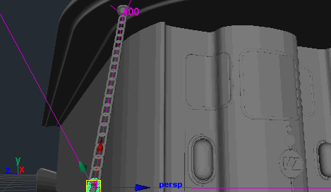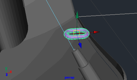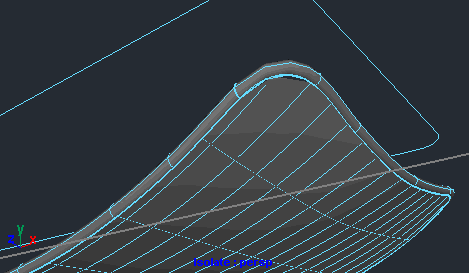 We still have to tweak few things to get the shape like in the initial model. But, we have to do one step before the CV's tweaking. Why? Because if we went to tweak the few CVs in the front side of this model, since the surface is tangency smooth, we will not get the sharp transitions like in the colored picture from above. Because of that, we will break the tangent continuity in two isoparms and then tweak the CVs to get the desirable shape. Select the two isoparm as in picture below and then Edit Nurbs > Surface Editing > Break Tangent.