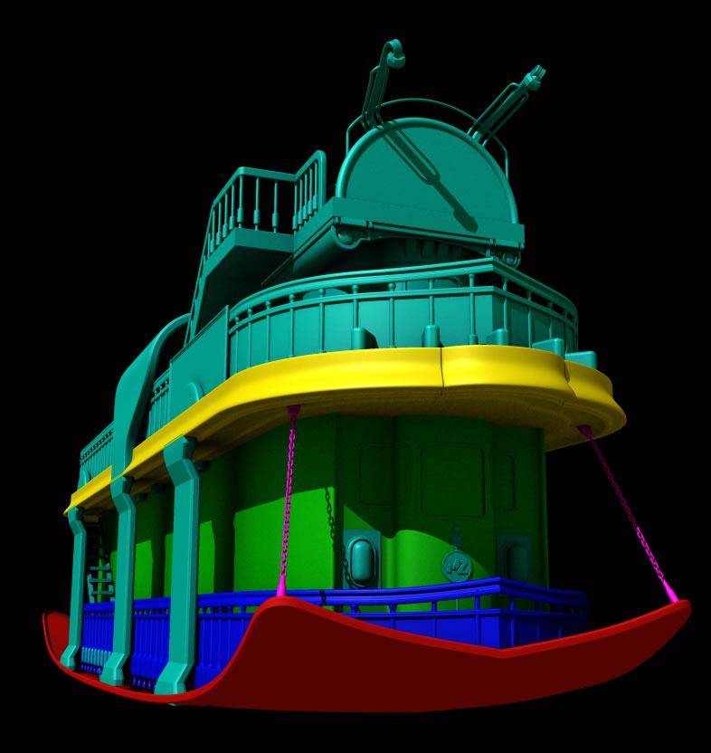 Modelling One of the tedious and time consuming part when creating pictures is modeling. But ... you need to do it ... empty scene is not very interesting for the viewer. ;) So let's go and see what I have done in this scene when it comes to modelling. First, I will list the tools I use often. The detailed explanation of those tools can be found maya manuals. It is best to create empty scene and test these tools until the moment when you are familiar with them. Remember that you need a lot of hours working with basic Maya tools before you have enough practice to take the next step and create a little more complicated stuff. Just to give you a short list of the tools I use very often when modeling: Create menu: Nurbs stuff: sphere, cylinder, plane, circle ... Polygon stuff: sphere, cube, cylinder, plane, CP Curve Tool, Edit Curves menu: Attach and Detach curves, Open/Close curves, Cut curve, Curve Fillet, Rebuild Curve, Surfaces menu: Revolve, Loft, Extrude, Bevel Plus, Edit NURBS menu: Project Curve on surface, Trim Tool, Insert Isoparm, Polygons menu: Create polygon tool, Append poly tool, Combine, Booleans, Smooth, Edit Polygons menu: Texture > Planar Cylindrical and Spherical mapping, Subdivide, Split Poly Tool, Extrude Face, Bevel, Cut Faces Tool, Merge Verices, Fill Hole. But let's see how can they be used to build up objects. I will take a few models from the scene and explain the process of modelling them. BTW the models from this scene, individually, are not complicated to do, but when you stick them all together in the scene they give a different, more complexed perspective. Left Building For my first example I will take the model of the building on the left. Some elements of this mode are left out compared to original model from the picture, to make things simpler. I have rendered one image with that model. It is divided by colors so it can be easier to explain what I am talking about. Just click on the image to get the full size.