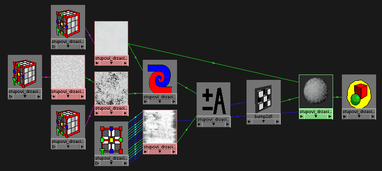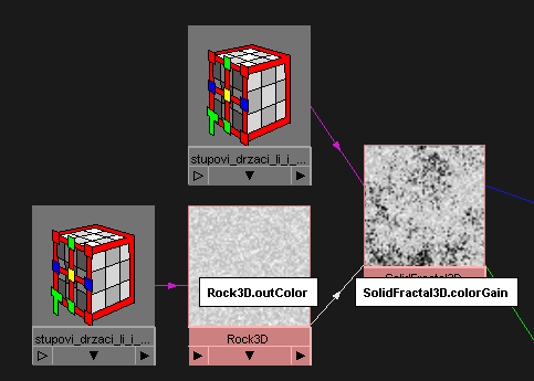 The first three objects are rendered with separate bump, diffuse and color layer and the last one is the result of combining these three layers. As you can see the result looks pretty realistic and combined with good lighting it produces exactly what I want. Now let's examine this shading network a little bit more. We will go layer by layer and step by step. ;) First the bump layer. Bump layer, as you saw previously in the screenshot of this shading network was produced with the three procedural textures. The textures that I have used were Rock, Marble and Solid fractal. These were all 3d procedural textures which means that they don't need the UV map for them to be mapped correctly. One good side of the 3d textures is that you can easiliy move them through the space and get different texture appearance on the object. This way you can manipulate them to get the chunk you want. Let's see what is happening in the hypershade, starting from roots:
