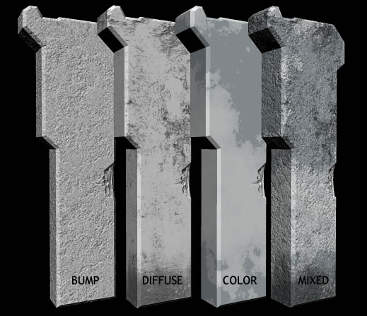 As I said before, since this pillar is made from the material similiar to concrete, I have used the simple lambert shader. The lambert shader was mapped with the procedural color map, the image diffuse map and to simulate the roughness of the surface I have used the bump map with three combined procedural textures plus small mix of image map from diffuse. I can not explain exactly why I have chosen these procedural textures since this comes from practice, but I can show you the result of mixing them together and the way I have used them. It would best to experiment with these textures and learn how they behave when you change their parameters. You have the IPR render for that so don't hesitate a lot ;) Let's take a look at the diffuse, color and bump layers: