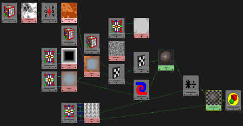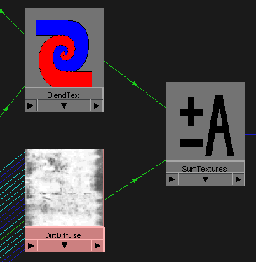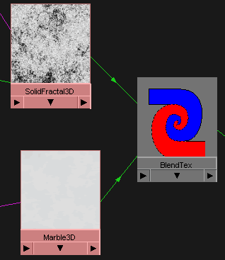 The rock 3D is the first texture ... it lies at the bottom of this shading network. It has the connection to the SolidFractal3D.colorGain. To make connection between them just drag and drop the rock to fractal using midle mouse button. What this does is that the color informations from Rock 3D are used to multiply the values from SolidFractal. Of course, the options of both textures were modified from thir default values. I have spent some time tweaking them to get the right result ... don't think I got it with first shot. ;) Then there is another procedural texture that is mixed with the previously created SolidFractal. This one is marble (picture below) ... again slightly tweaked to fit my needs. Blend node (blue-red below) was used too, as the name says, to blend these two textures together. There is a slider in the blend options called Blender with which you can change the blend factor of these two. If it is set to 0.5 then it will use 50% of the first and 50% of the second texture to mix them together. In my situation I have set it to 0.7 to use 70% of the second texture (marble) and blend the 30% of the other input which is solidfractal. The blend factor can be mapped with any other floating value .... so if you would have the need to do some more complex textures be free to try to map it with some 2d or 3d textures.