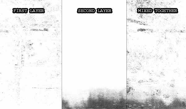 The next step was to make the color and diffuse channels. These two were very simple. On the color channel I have mapped the marble texture, as shown in the image before. It gives the slightly color variations to the whole texture. Since I have showed the color layer with marble texture before, I will not do it this time, instead I will jump to the diffuse map. The diffuse map was created using two image textures from my collection. These were mixed together in the Photoshop. The first layer has distributed dirt all around the image while second image was used to get the dirt at the bottom part. It is a usual task to repaint them a little bit. In this situation I have erased some parts of the second layer. The example of these two mixed: