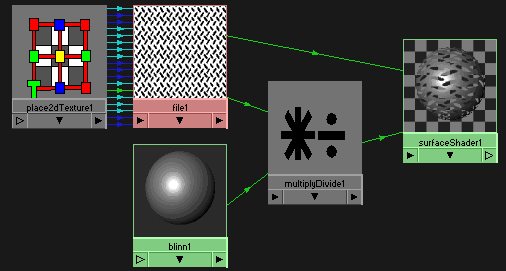 What's wrong with this shader, is that in areas where the specular is visible, the transparency doesn't look as it needs to. So if the surface is so transparent then the specular should only appear at the parts where the transparency is at zero. The first solution would be to use the same texture to tell specular where it should appear and where not. But what if you have to do this for other channels, like reflection, incandenscence. Then you would need to make 3 connections to the other part of shading network to solve this problem. Lucky for us, there is a simpler solution, and that is to pass the color informations from this shader to the surface shader and map the surface shader with transparency. But, the color information from the base shader must be multyplied with the transparency image before we do the connection to the surface shader. This is shown in the picture below...