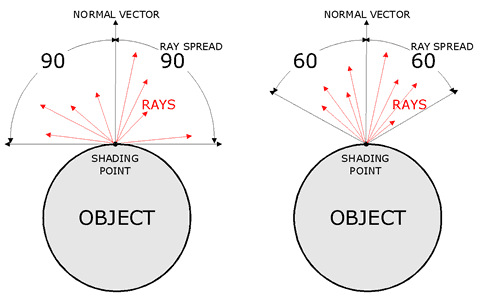 Let's go back to Dirtmap. First the Base Color and Dirt Color. If they are set to default then the base will be white while the dirt will be black. This is what we want most of the time, especially if we will use the dirtmap pass in postprocess. There would be some times when you would want to use the dirt map directly in the scene ... so in such cases you can probably play with these colors ... for example set the base color to something like blue and connect it to the ambient value of lambert shader. But let's stick with black and white for the moment. So leave this values as they are, but be free to play with it. ;) The Ray Spread value is used to set the angle in which the occ pass will collect the information around the shading point. The value you set is maximum angle from the normal vector to the emited ray. I created a little picture (below) to show you visualy what that means. If the value is set to higher value like 90 then all objects that fall between this angle will influence the occlusion value. Of course, if you set it to lower value like 60 then the rays will be shot at lower angle values and some objects that are nearby, but not directly in front of the object, may not contribute to the occ values.