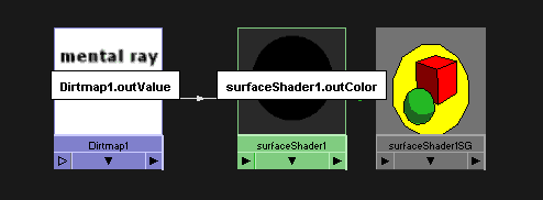 So how to create the occlusion pass. Well, the occlusion shader does not come as a default shader in mentalray library, so you would probably want to use some third party shader. The one that I have used in this scene was Dirt Map shader from the Daniel Rind. You can find it at his webpage at: http://animus.brinkster.net Just go to the stuff section and DL it. The instructions how to install it comes with it. Once you have installed the dirtmap shader it will apear in the mentalray Miscellaneous section in hypershade. You can acces this from the drop down Create menu or by the shader menu on the left of hypershade working area. So create it by clicking on it. Once you open it you will see a bunch of options. The Color Base/Dirt, Ray Spread, Near/Far Clip, Samples and Falloff Gain are the most important one in this case and these are the ones I will explain. I will show this using the simple scene just to make things a little bit clearer. But before I begin with explanation there is one thing to do. The dirt map is not the shader so it can not be directly conected to the objects in the scene. That's why you need to create the Surface Shader (Maya Surface Nodes) and connect the Dirt Map node to the color value of the surfaceShader, like this: